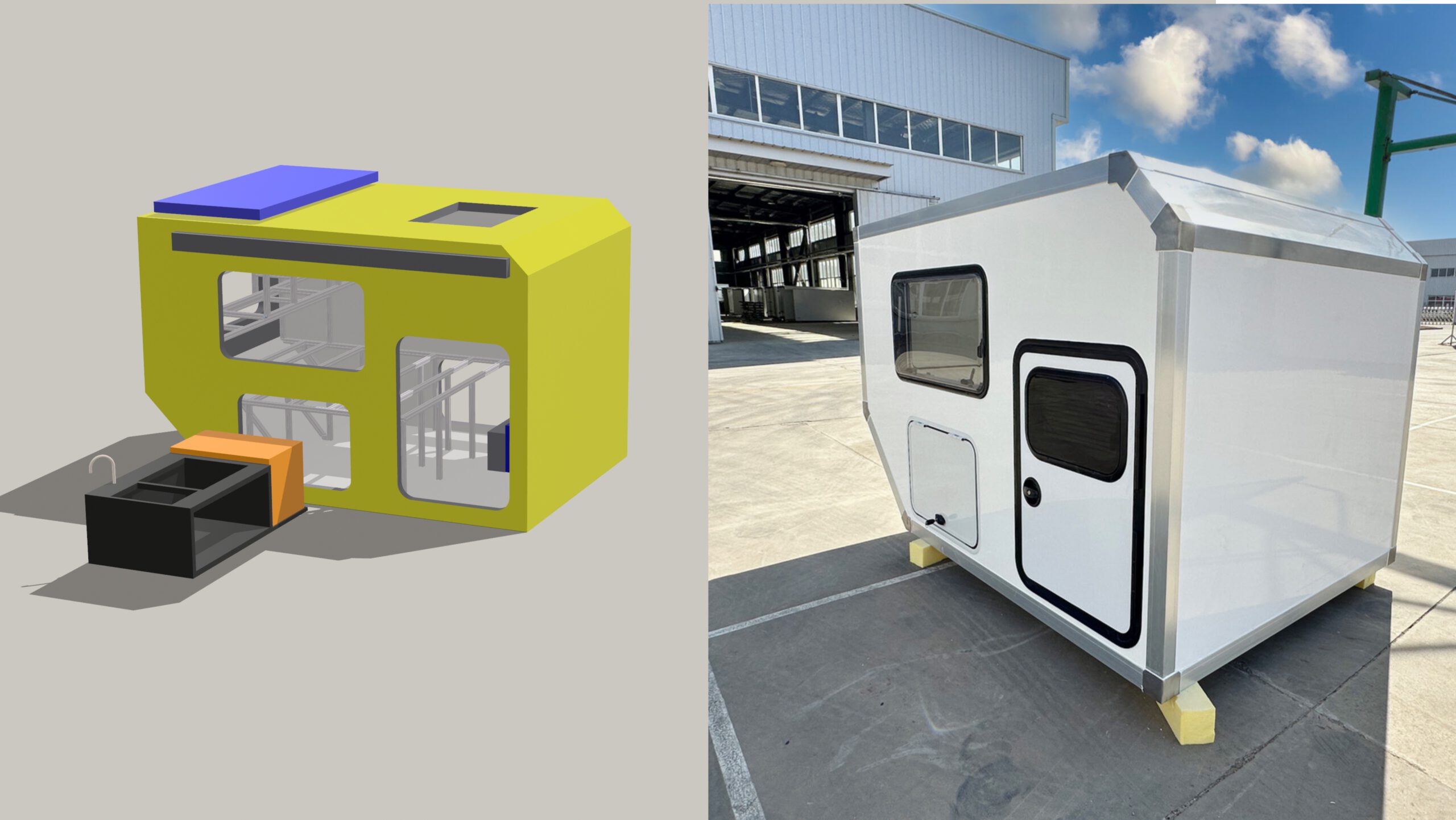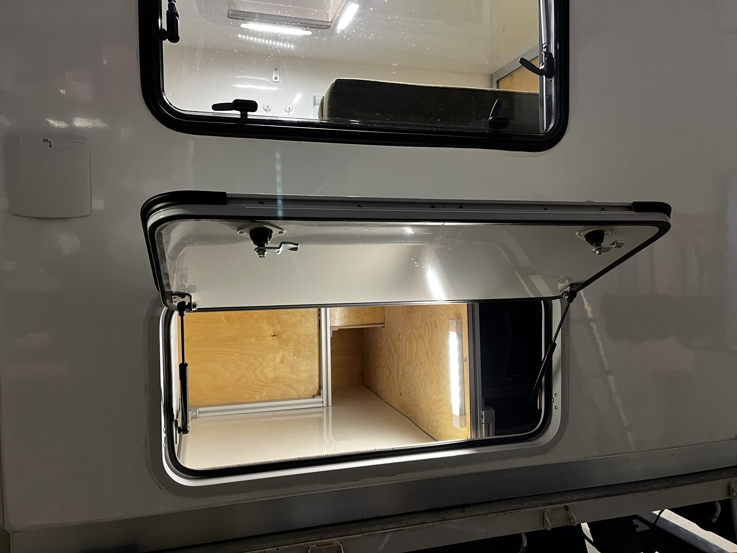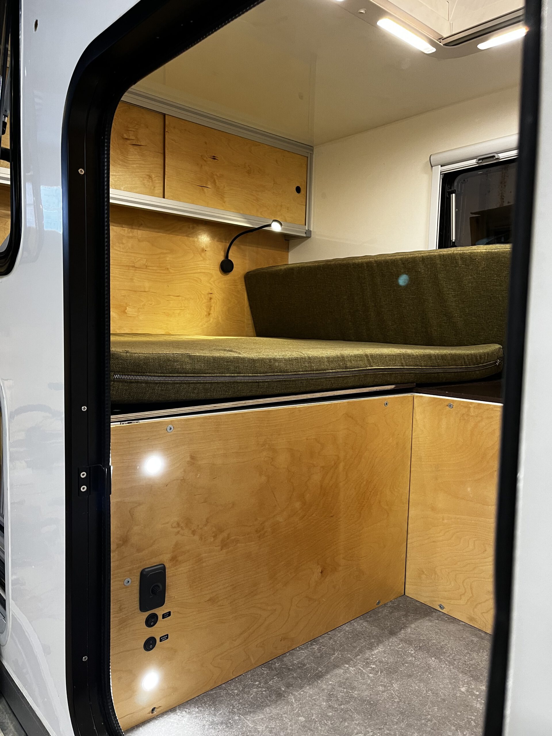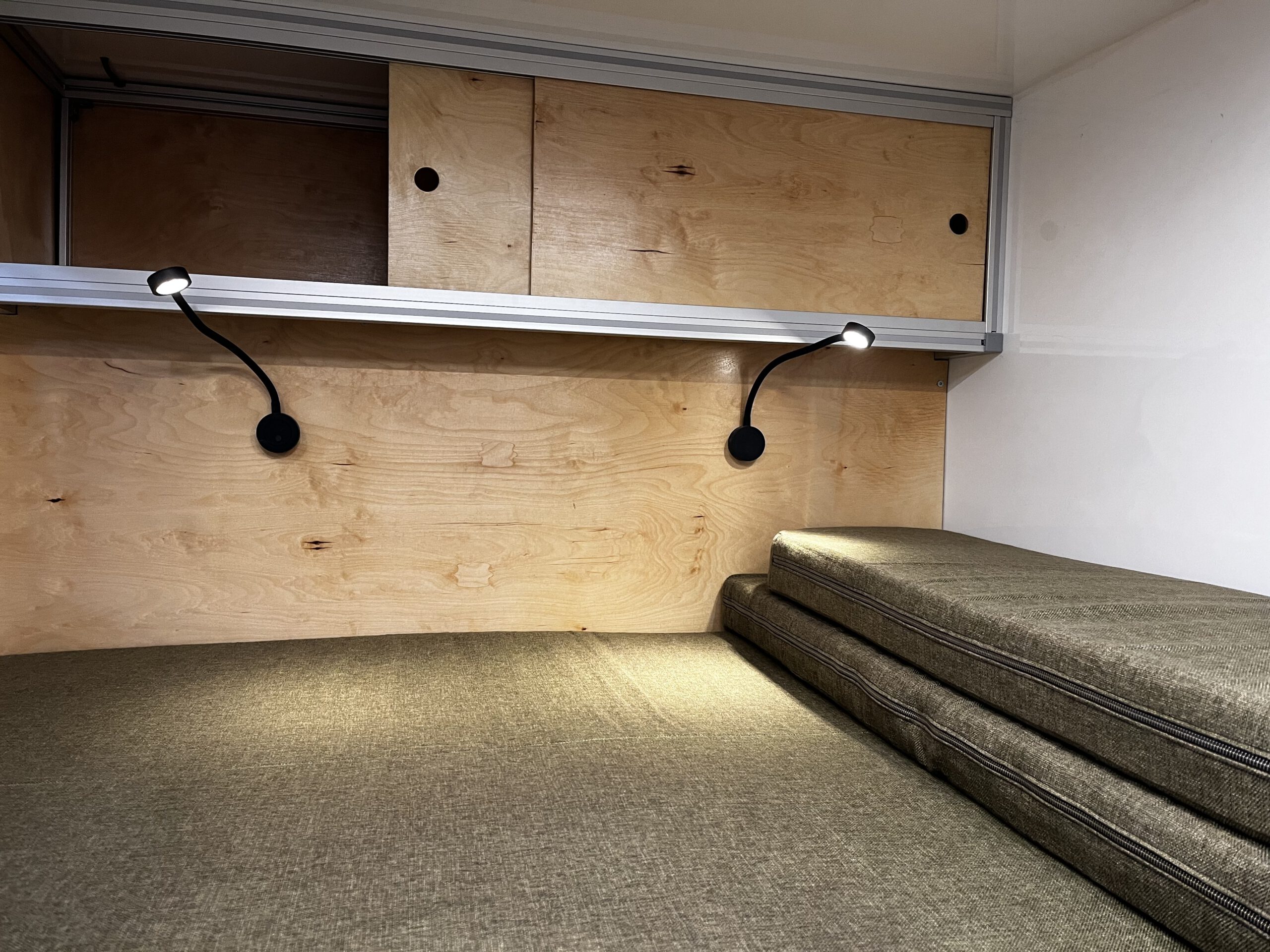 On the back of the car we wanted to create something special. Inspired onย ‘teardrop‘ย caravans and expedition campers – we designed a custom micro camper cabin. It offers a generous sleeping space, protection against the elements, ensuring a peaceful night’s sleep under the stars.